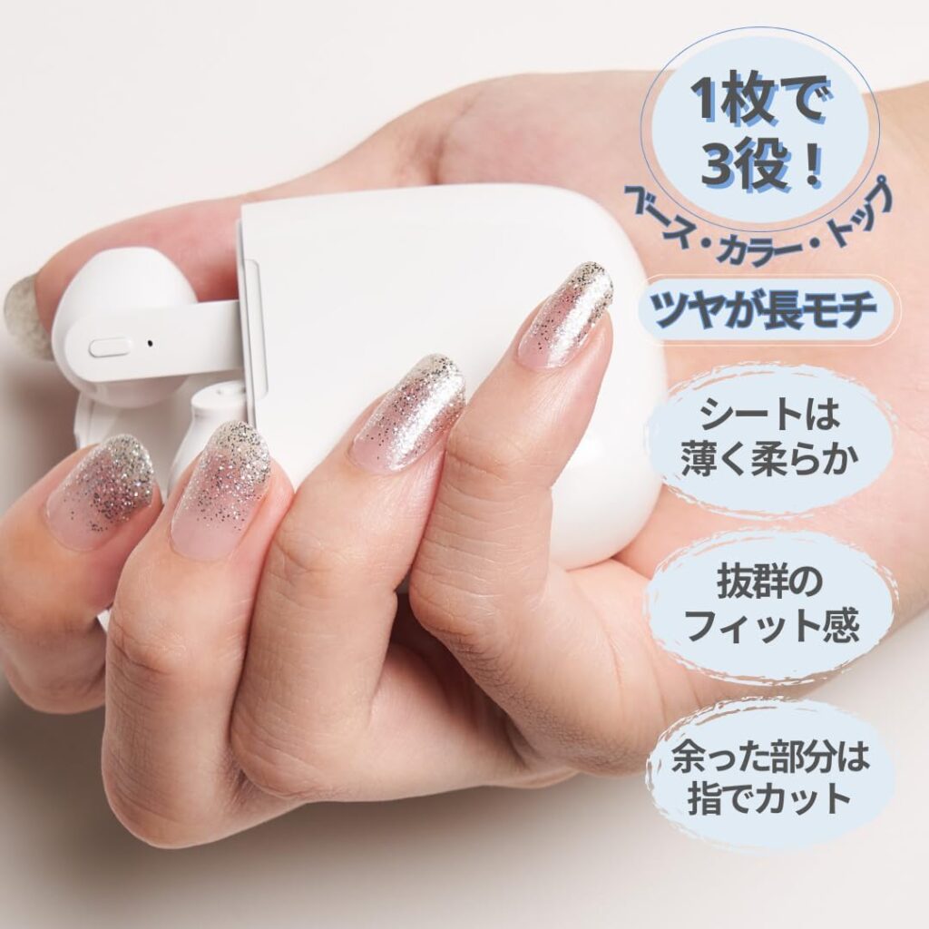 - ネイルシールの手軽さと高品質を両立し、ベース・カラー・トップが一体のネイルシート。
