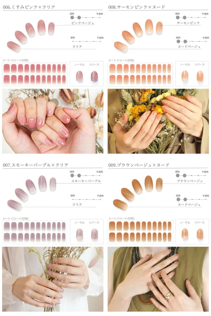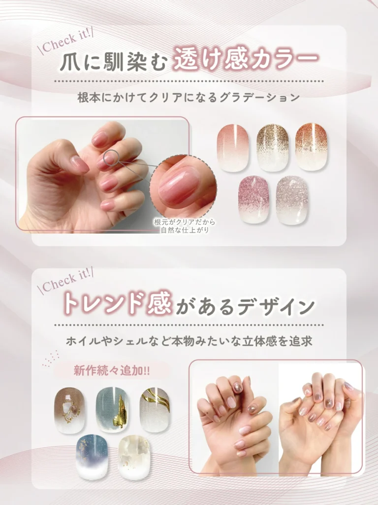 | 備考 | ・デザイン数が多い ・ジェル/セミキュアタイプあり | ・デザイン性が高い ・初心者でも使いやすい | ・サロン風の仕上がり ・セルフネイル派に人気 |