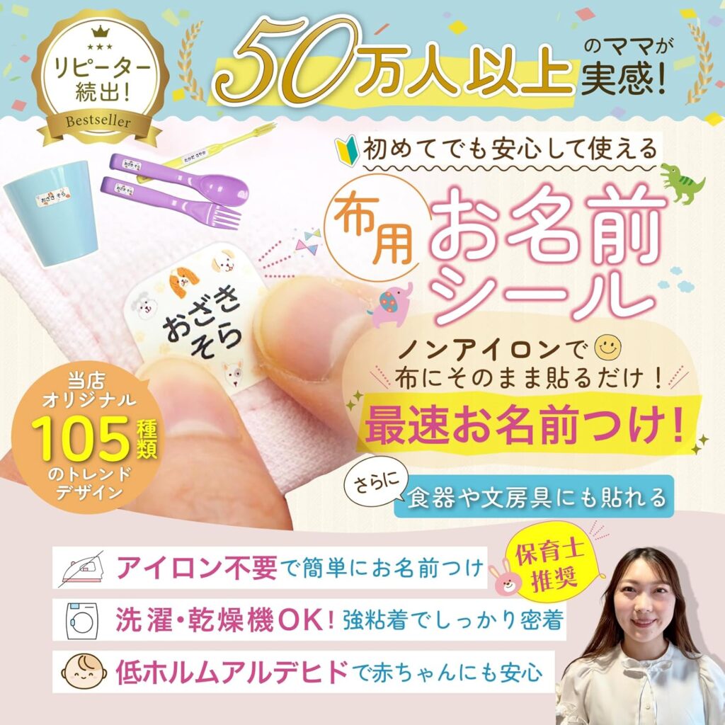 | お名前シール★ラボ ノンアイロン布用 お名前シール | ★4.6 | ・3種類 | ・アイロン不要 ・赤ちゃんOKの低ホルムアルデヒド ・耐久性◎(洗濯、乾燥、食洗機OK) | Amazon | 1,780円 | 無料 |