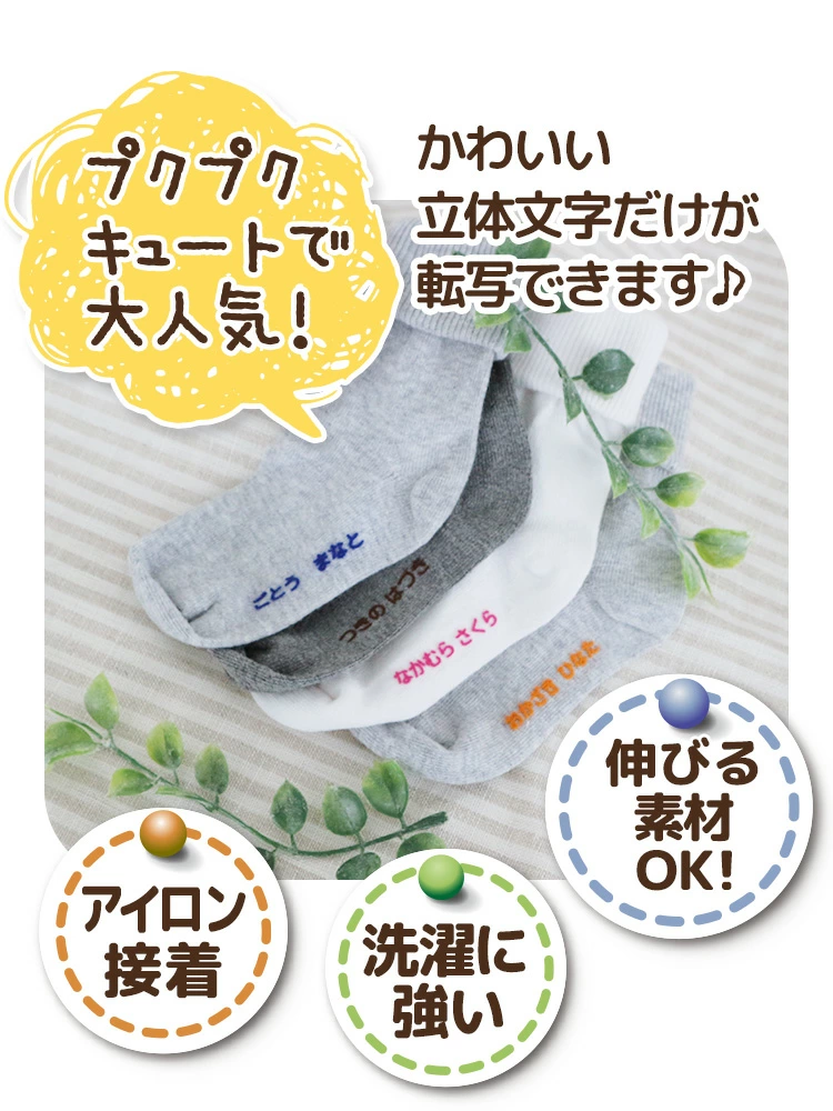 「かわいい立体文字だけが、転写できる名前シール」をお探しなら、「やくだち お名前シール」がオススメですね。