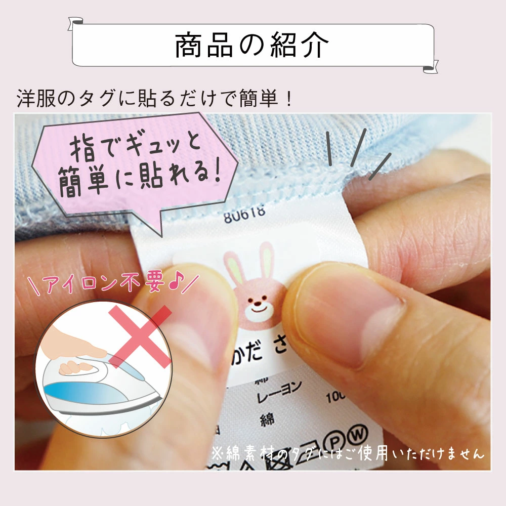 - 洗濯タグに貼りつけるだけでOKで、 アイロン不要のおなまえラベルです。