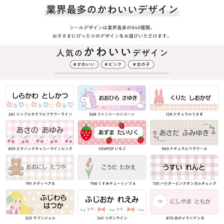 - シールデザインは業界最多849種類で、1シートに好きな絵柄を5種類まで選べます。