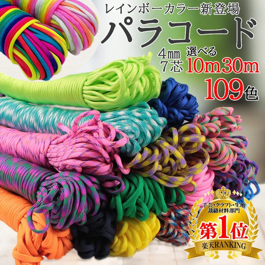 | パラコード ハンドメイド用 | ☆4.73(口コミ2,213件) | 4mm×10m/30m | 107色から選べる豊富なカラバリ。DIYクラフトやアクセサリー作りに最適な高コスパモデル | 楽天市場:560円 送料無料 |