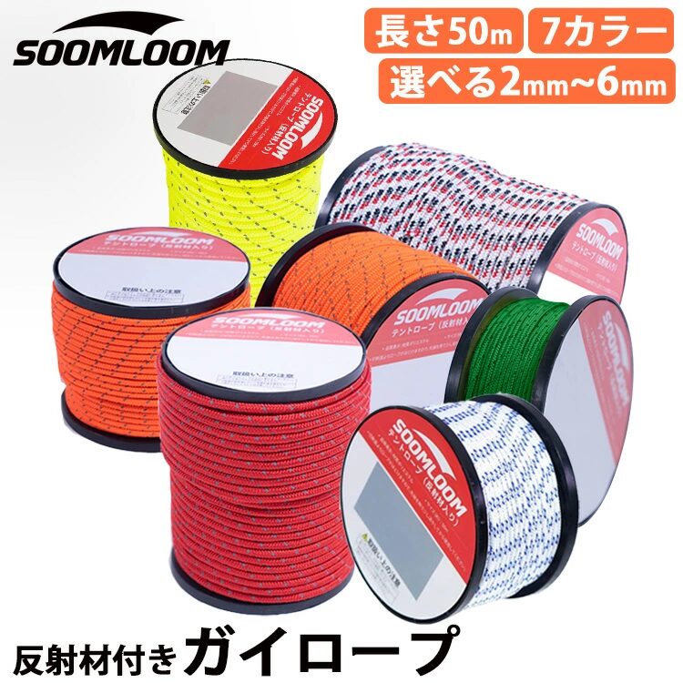 | Soomloom ガイロープ | ☆4.57(口コミ558件) | 直径2mm/3mm/4mm×全長50m | 反射材付きでタープ設営や荷物固定などアウトドア用途に幅広く対応 | 楽天市場:1,580円 送料無料 |