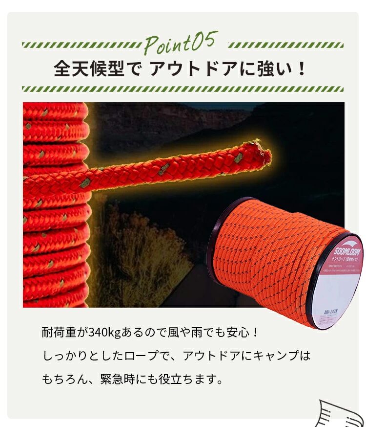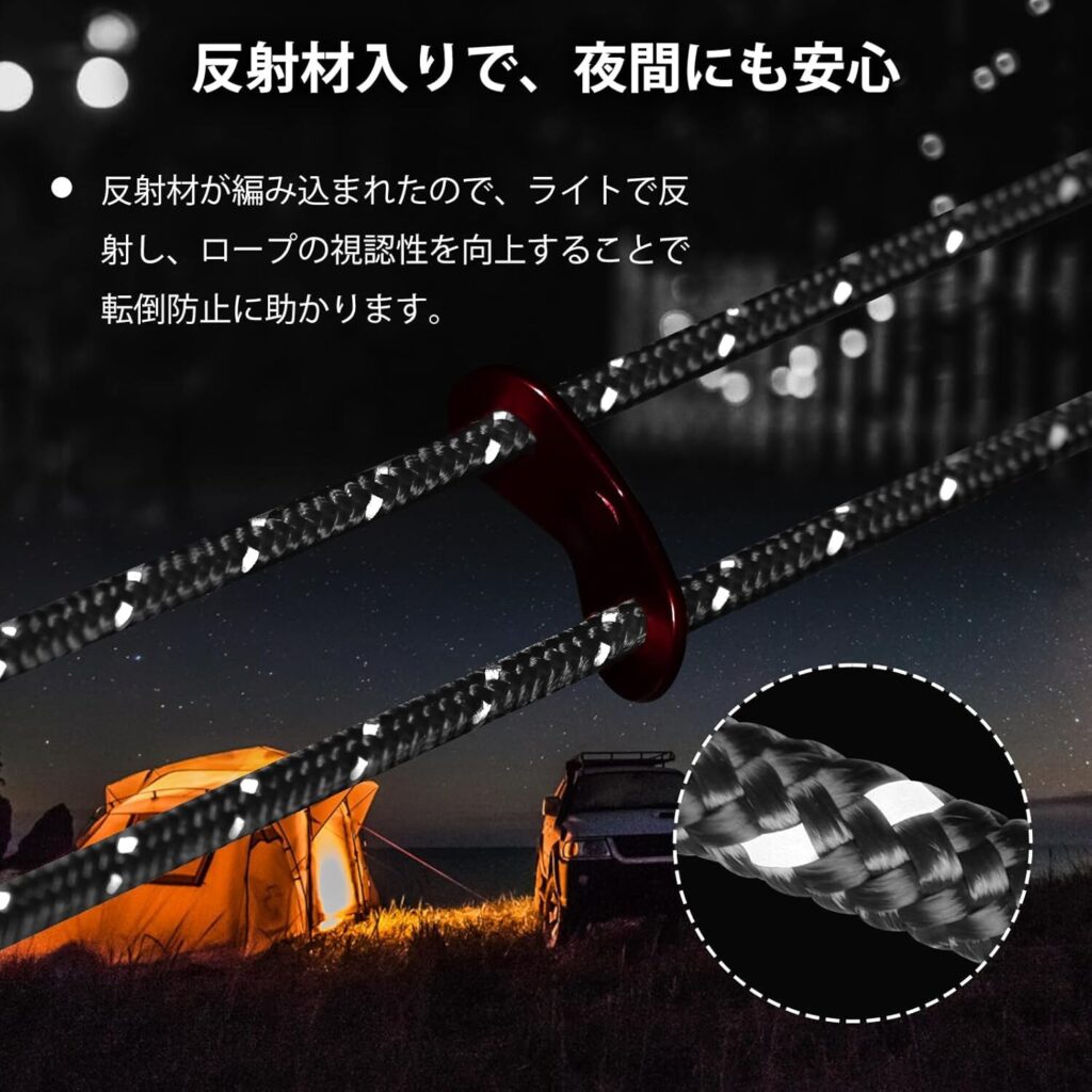 - テント設営や荷物固定に十分な強度があります。