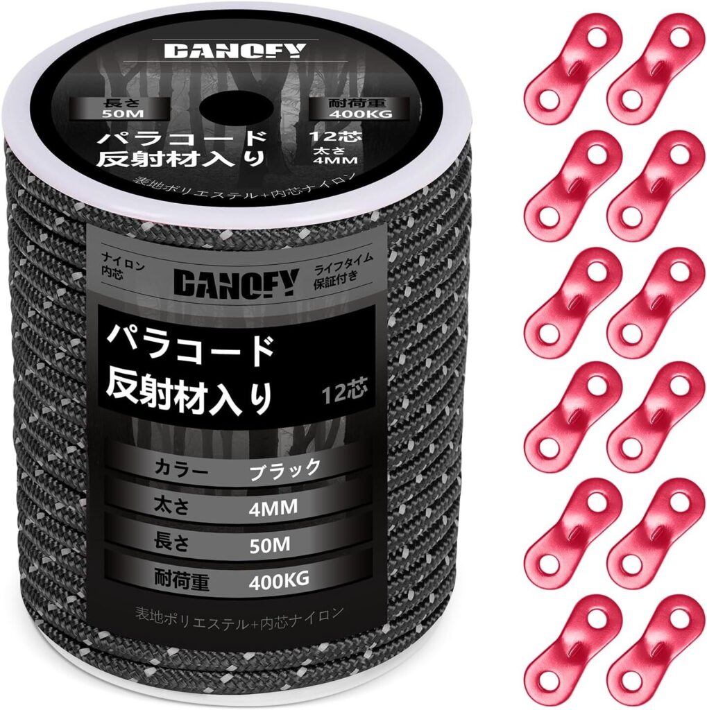 | DANOFY パラコード | ☆4.2(口コミ510件) | 4mm×30m | 反射材入りで視認性が高く、アルミ製自在金具10個付き | Amazon:1,513円 送料無料 |