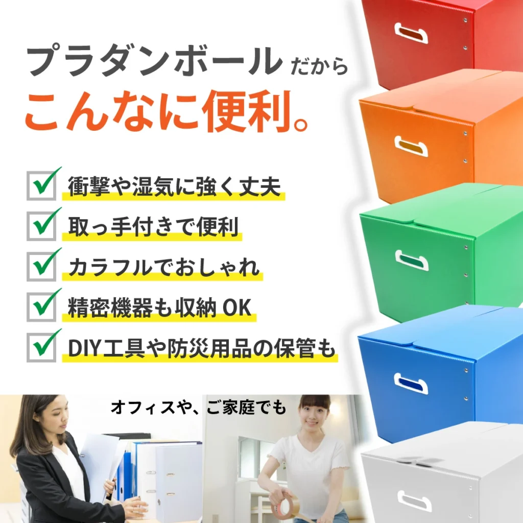 - 紙のダンボールと違い、何度も繰り返し使用できますので経済的です。