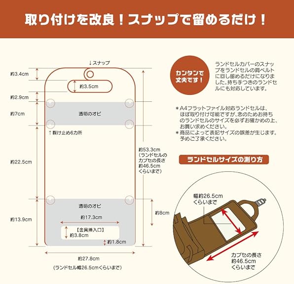 ブンチョスナップを留めるだけで装着できるランドセルカバー