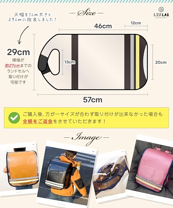 | L.Y.F LAB 丈夫で綺麗が続くランドセルカバー | ★4.6(572件) | 57×29×0.5cm | 反射&蓄光テープで安全性抜群。防水・静電気防止加工。耐久性に優れた設計。 | Amazon/価格:約1,780円(税込)/送料:無料 |