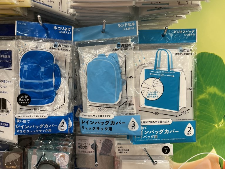 他にもポリエステル素材のポケット付きのタイプや、持ち運びやすいランドセル兼リュック用のレインカバー、お値段も110円から330円まで、色んなランドセルカバーが揃っていました。