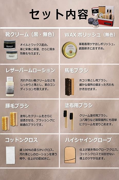 - セット内容:靴クリーム(黒or無色)、クリーニングローション、馬毛ブラシ、豚毛ブラシ(ミニ)、アプライブラシ、コットンクロス、ハイシャイングローブ
