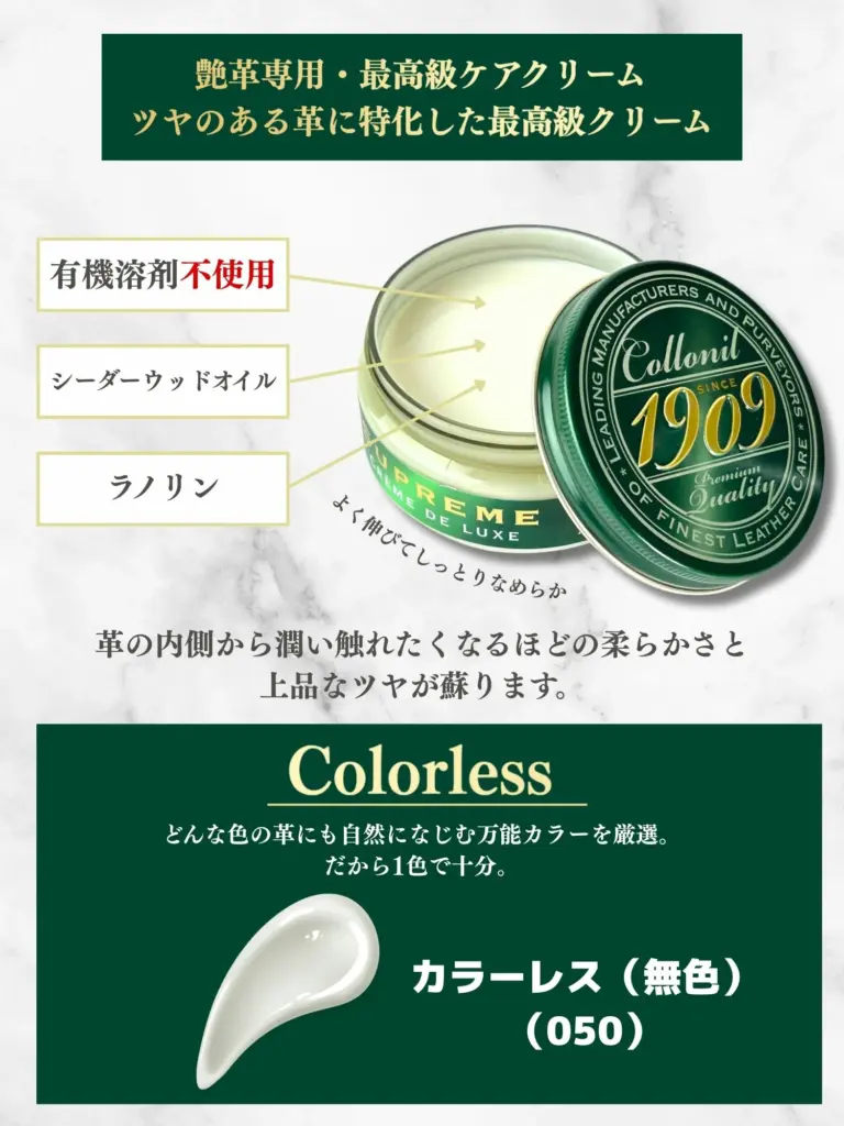 「ツヤのある革に特化した最高級クリームの靴磨き」をお探しなら、「Collonil シュプリームクリーム」がオススメですね。