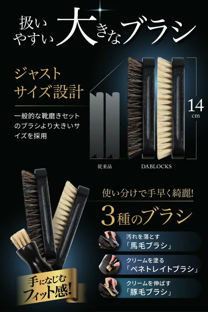 「初心者でも5分でできる、靴磨きセット」をお探しなら、「3種のブラシ入り 靴磨きセット」がオススメですね。