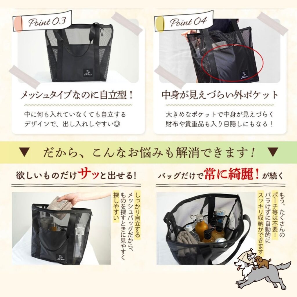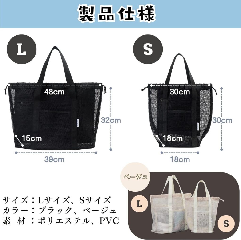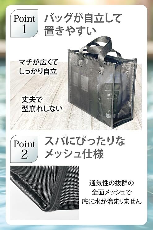 | 三八商店 スパバッグ | ★4.0 | S:30×30×18cmL:48×32×15cm | 防水×メッシュ構造/濡れ物と乾物を分けられる | Amazon価格:¥1,280 送料:無料 |