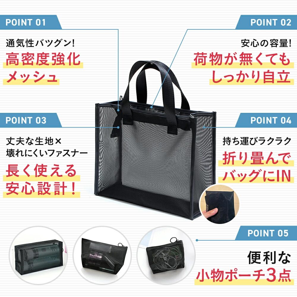 メッシュ素材で軽いので、畳んで旅行や出張などにも手軽に持って行ける便利なバッグ。