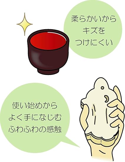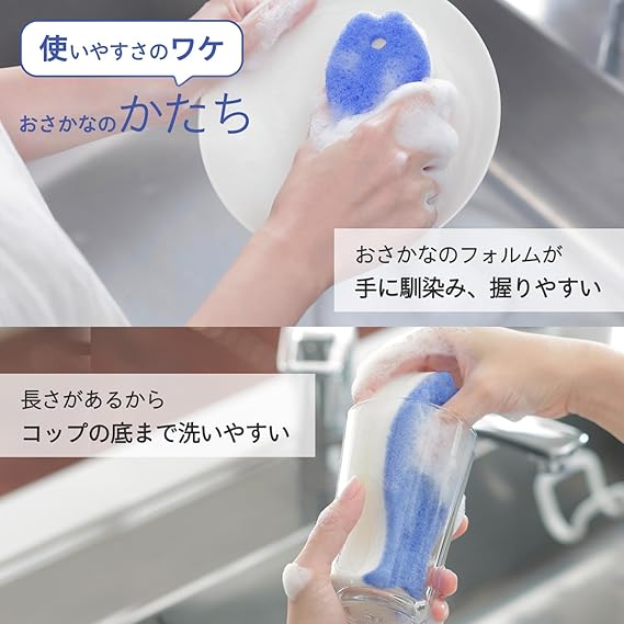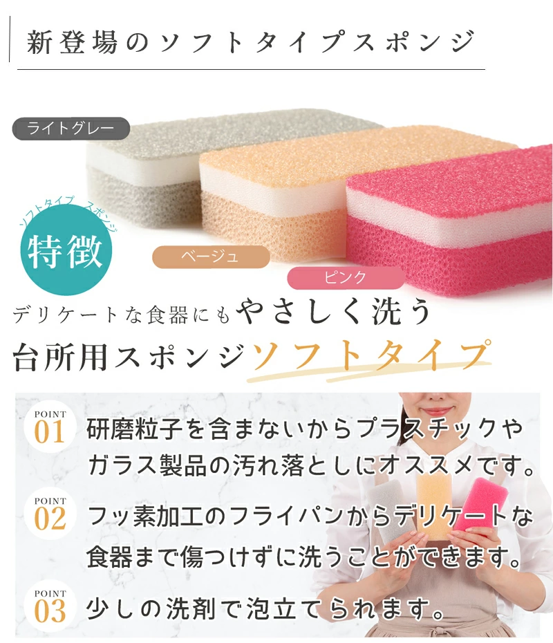 - とてもやわらかいスポンジと不織布を使用しているので、使い始めから手になじむやさしいスポンジです。