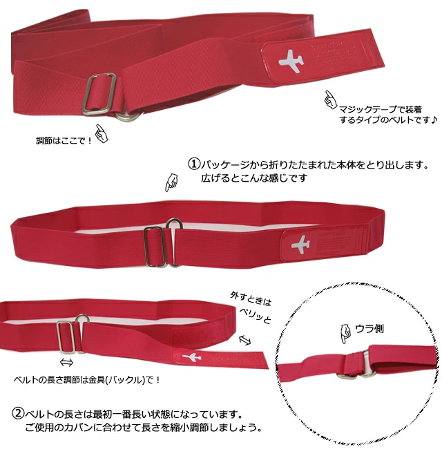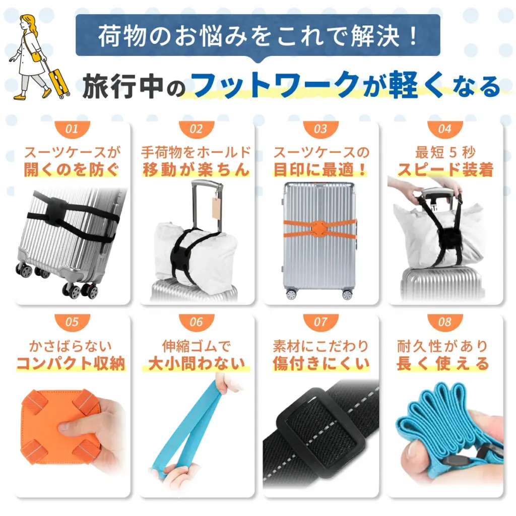 - 伸縮素材を採用し、さまざまなサイズのスーツケースにフィット(長さ調整も可能)。