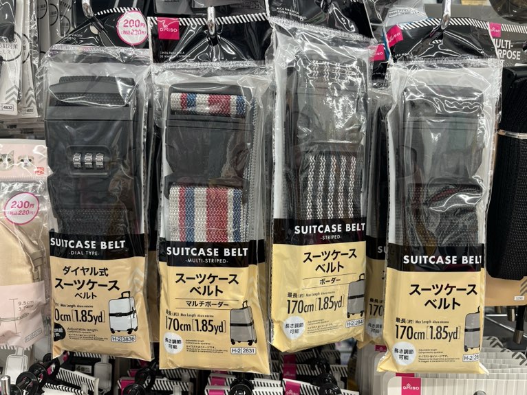 スーツケースベルトは100均ショップで取り扱いがありました。