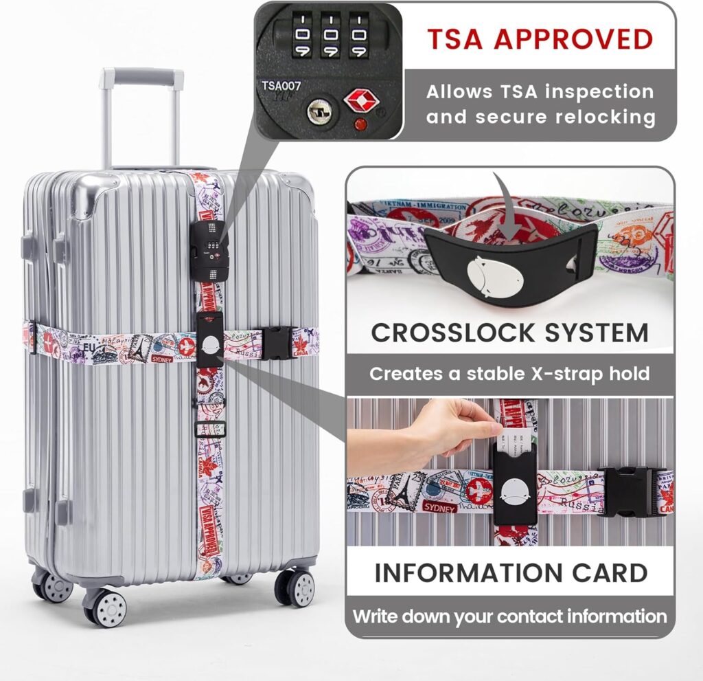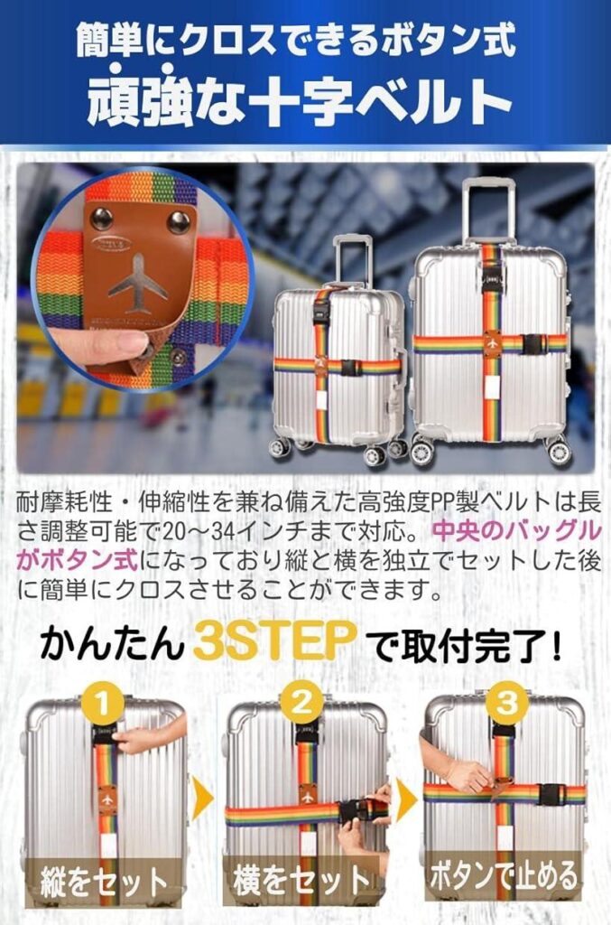 | Travelkin クロスラゲッジストラップ | ★4.2/916件 | 垂直220cm/水平190cm/幅4.8cm/対応20〜32インチ | ・TSAロック搭載/3桁ダイヤル式・縦+横のクロス構造で強力固定・耐衝撃性ハードウェア+高耐久ポリエステル素材・カラフルなデザインで識別しやすい | 【Amazon】2,178円 送料無料 |