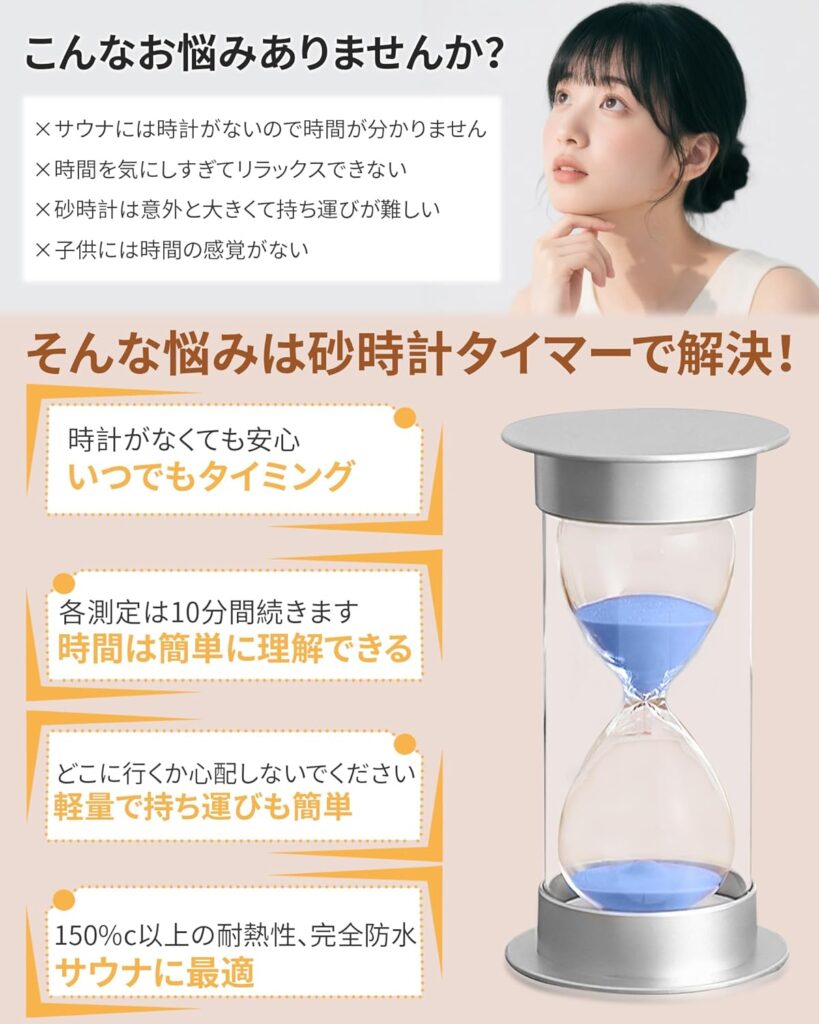 「浴室の滑りやすい床や、洗面所でのうっかり落下にも安心な、防滴&耐衝撃設計」の砂時計をお探しなら、「雲見 サウナ砂時計」がオススメですね。