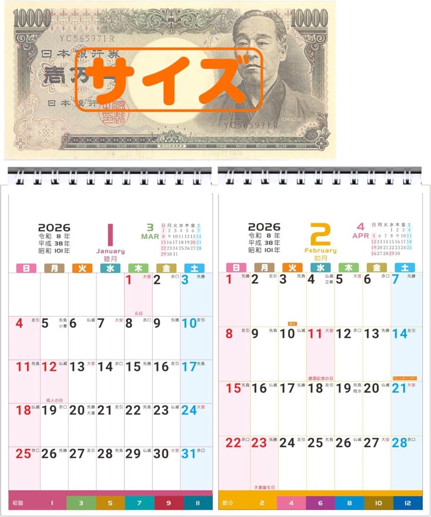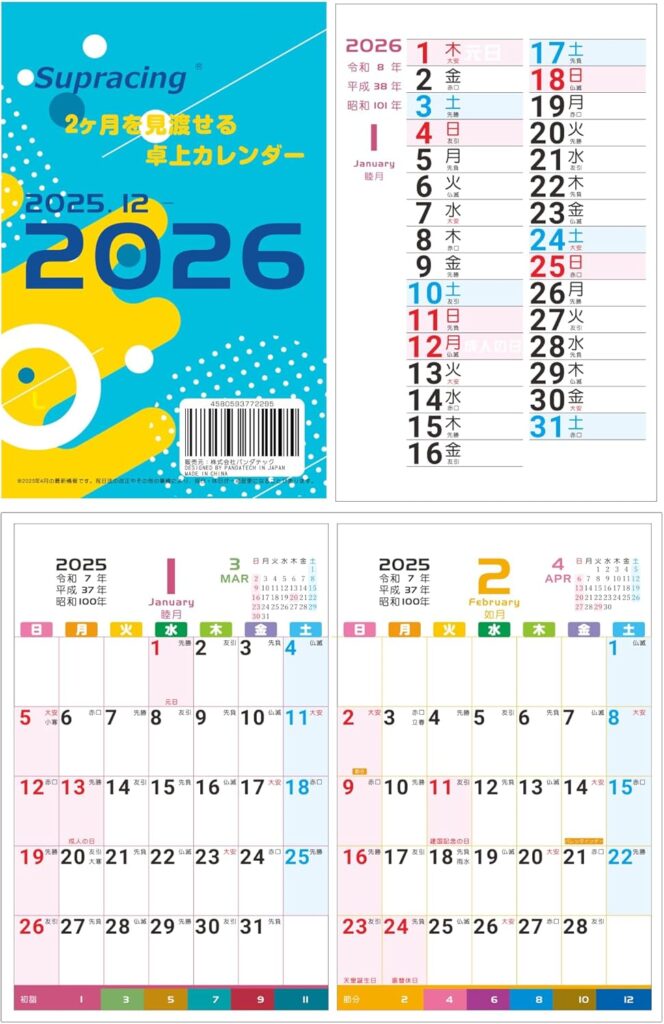 | Supracing 2ヶ月を見渡せる卓上カレンダー | ★4.1(66件) | 20×17cm | ・2ヶ月同時に確認可・六曜入り・見やすい数字とメモ欄 | Amazon約900〜1,200円前後送料:無料 |
