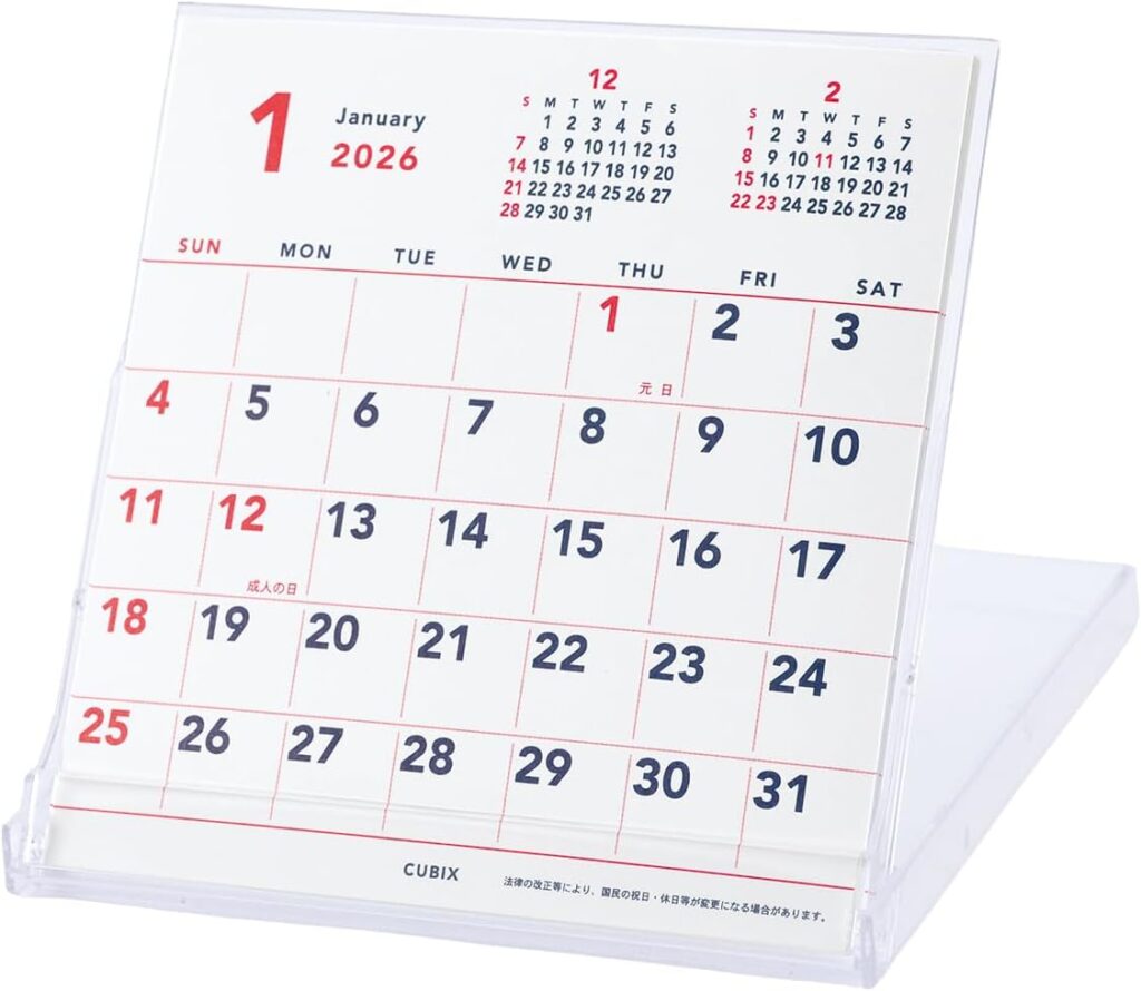 | Supracing 2ヶ月を見渡せる卓上カレンダー | ★4.1(66件) | 20×17cm | ・2ヶ月同時に確認可・六曜入り・見やすい数字とメモ欄 | Amazon約900〜1,200円前後送料:無料 |