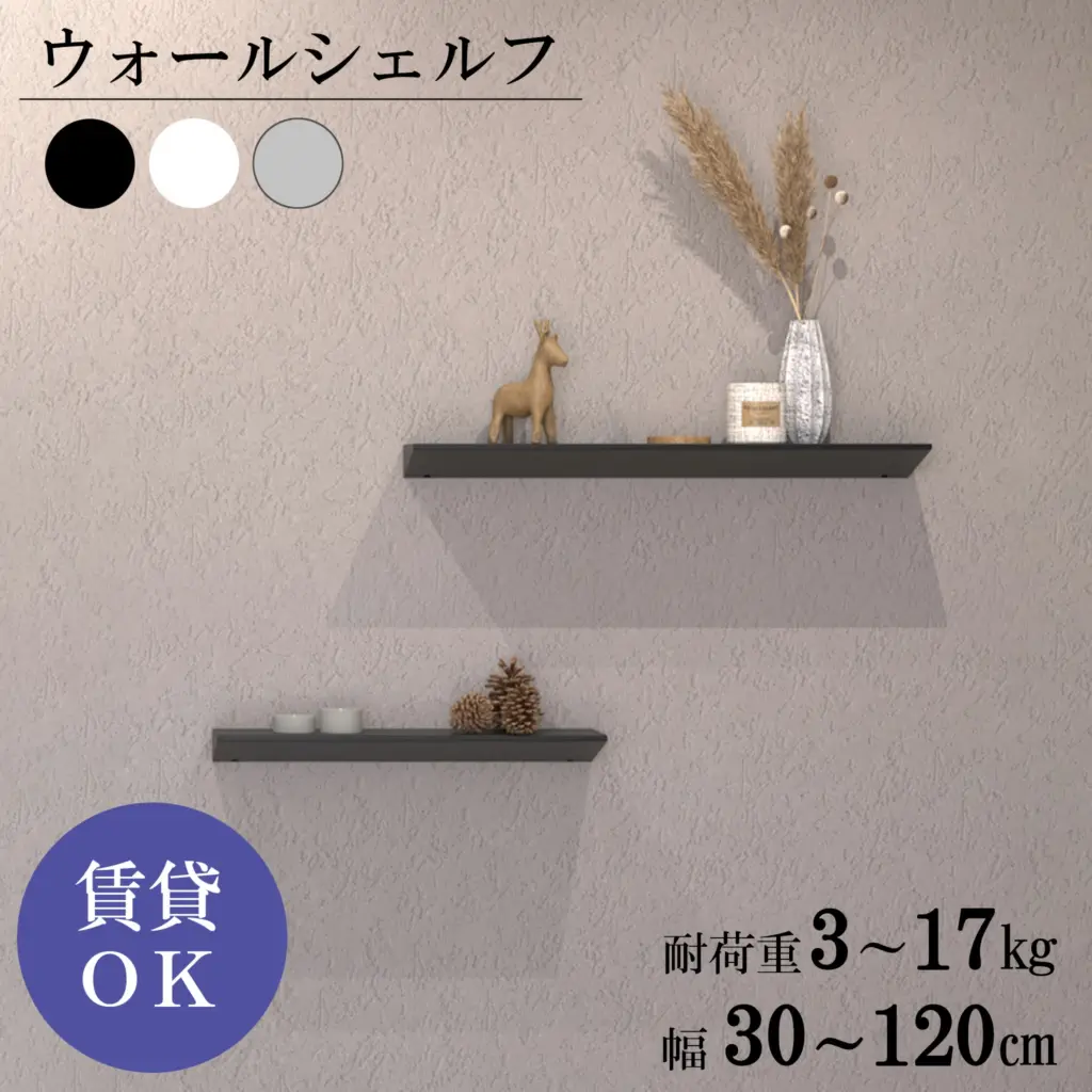 | アルミ製 ウォールシェルフ | ★4.37 | 幅30/45/60/90/120 cm(奥行12×高さ4 cm) | ・アルミニウム素材、石膏釘で賃貸対応 ・色:ブラック/ホワイト/ホワイトシルバー | 楽天市場 | 7,840円〜17,290円 | 無料 |