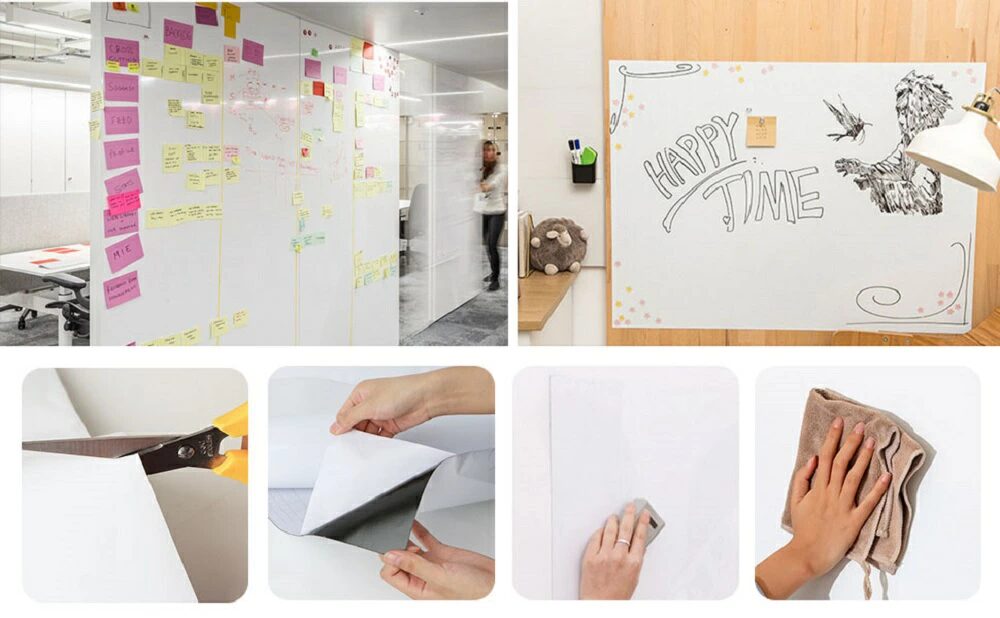 • ホワイトボードシートの裏面に粘着剤が付き、簡単に壁面に付着可能です。