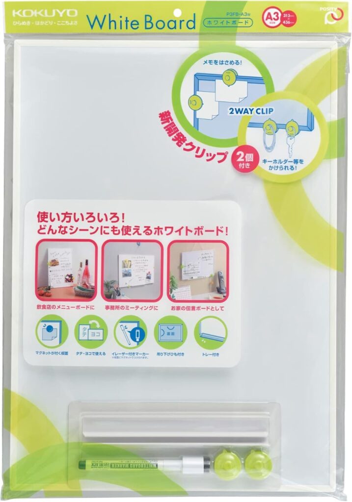 KOKUYO ホワイトボード★4.4(口コミ656件)A3サイズ縦横両用・吊り下げ紐付き・2WAYクリップ付き・付属品ありAmazon/¥1,220