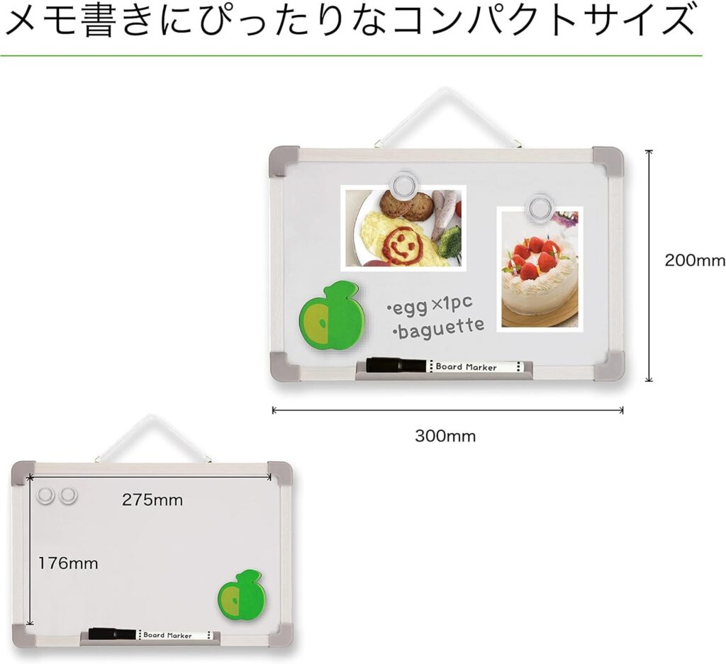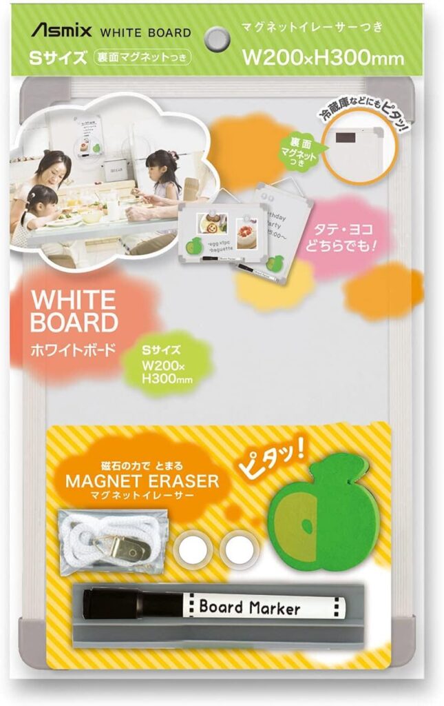 • 【付属品】オリジナルステンレス製マグネット磁石×2個、ネジ頭が隠せるキャップ付きネジ×4本、石膏ボード用アンカー×4本、イレーザー機能マグネット付きホワイトボードペン×赤黒1本ずつ、ドライバー×1本、鉛筆×1本