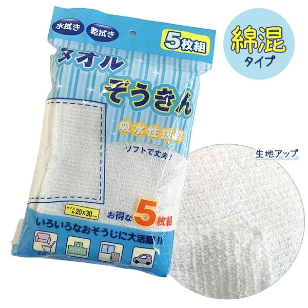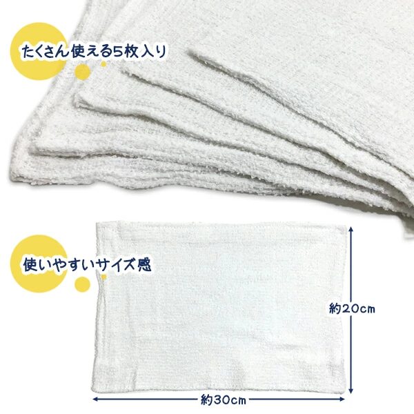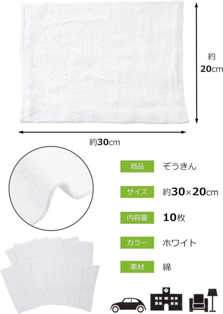 • キッチン、テーブルのお掃除用布巾、フローリングの雑巾、台所の台ふきん、窓ふき、洗車など様々な場面で使用できます。