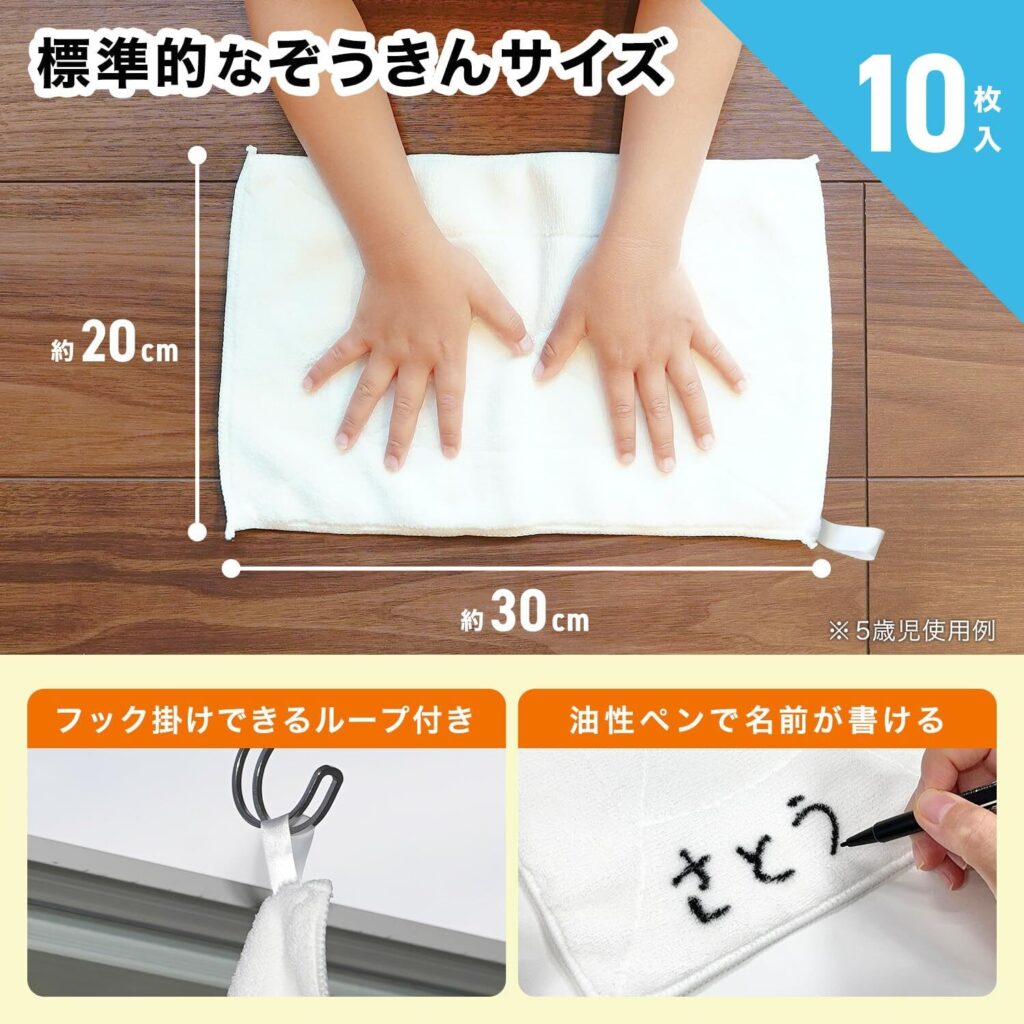 備考3枚入りでコスパが良い。掃除用としても使いやすい小さめサイズで園や学校の持ち物に便利サイズや用途の種類が豊富